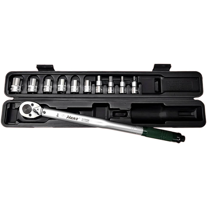 11-piece torque wrench set is built for precision, reliability, and durability. It features one 4170Nm/NF adjustable torque wrench paired with 6PCs Cr-V hand sockets (17, 19, 21, 22, 24, 27mm) and 4PCs hex bit sockets (6, 8, 10, 12mm). Ideal for workshop and industrial applications requiring consistent torque accuracy. Supplied in a durable blow-mold case.