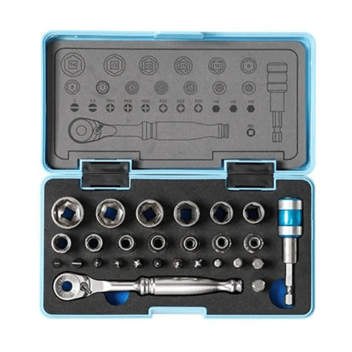 The parts are stored in a compact molded case with EVA-style layout and printed size map on the lid. Every socket and bit has a marked position: faster pick, faster return, less missing inventory.