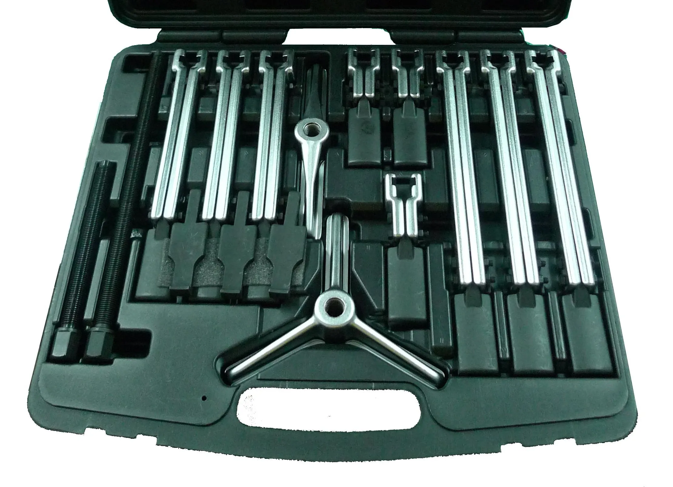 A versatile mechanical puller designed to remove gears, pulleys, bearings, and bushings from shafts internally or externally. It includes 2-arm and 3-arm beams, various forged hooks, and a threaded spindle, making it adaptable to different applications.