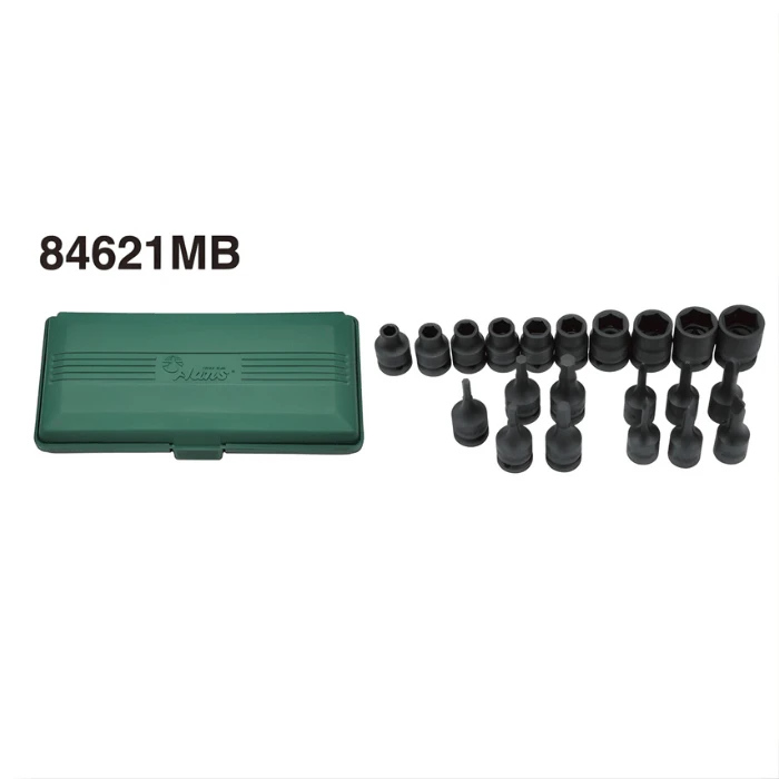 84621MB is a professional 21-Piece 1/2″ Drive Impact Socket Set designed for heavy-duty industrial and automotive fastener removal. This set is a specialized collection of high-torque drivers, combining 84400M standard impact sockets with a comprehensive range of impact bit sockets. Forged from Chrome Molybdenum (Cr-Mo) and finished in black phosphate, every component is engineered to withstand the shock loads of pneumatic and cordless impact tools. This configuration is specifically curated for technicians who already own a 1/2″ drive impact wrench and require a versatile range of metric hex and internal-drive (Star/Phillips/Hex) bits.
