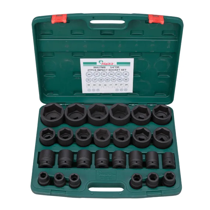 - 27-piece 3/4″ impact set supplied in a plastic molded case—built for heavy-duty use.