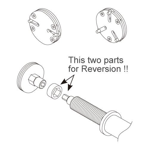 The two adapter plates can be reversed for clockwise or counterclockwise piston rotation, making this a universal solution for left and right-hand threaded pistons.